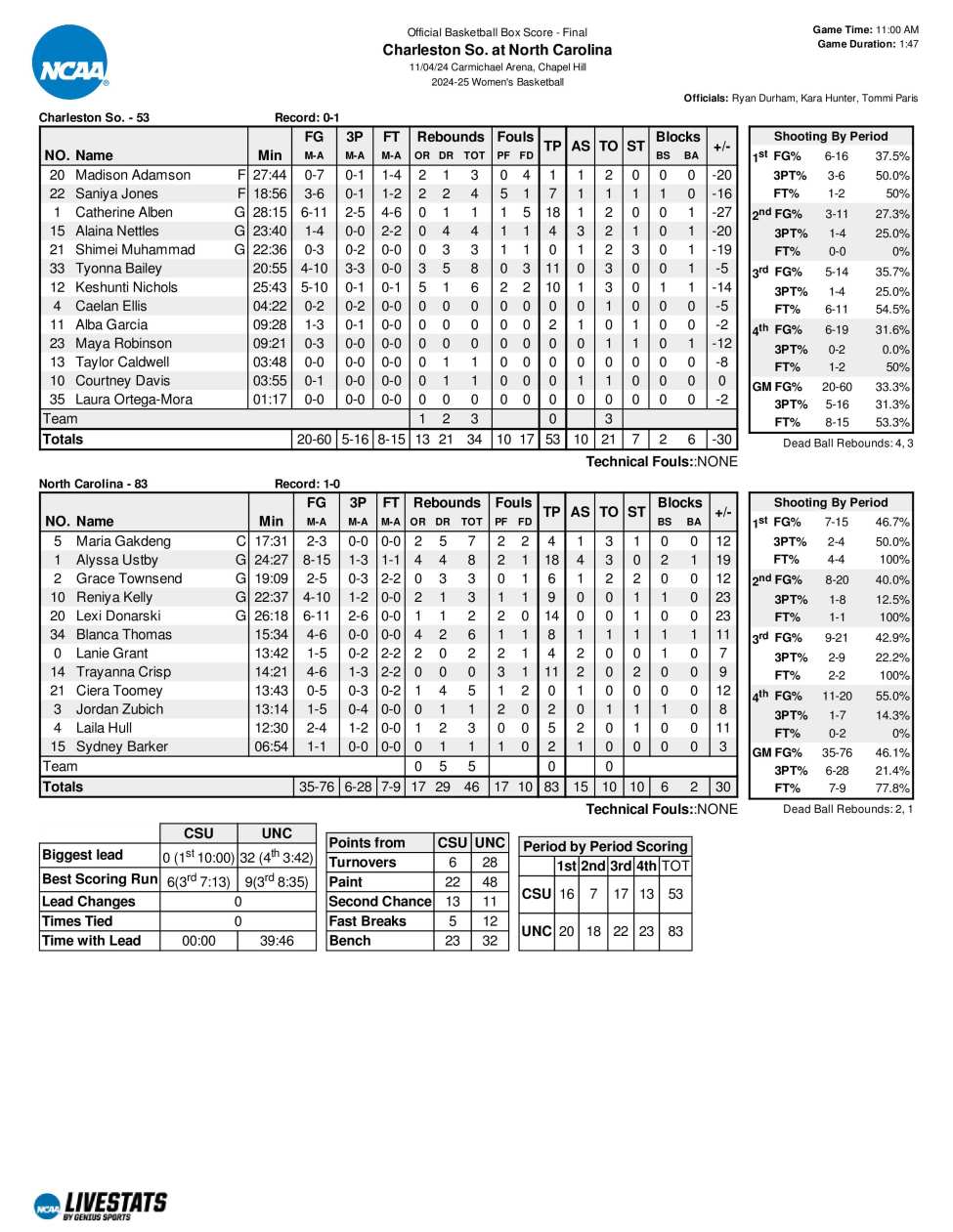 UNC scored 28 points off turnovers and 48 inside points while outrebounding the Buccaneers 47–34 but also committed 10 turnovers. UNC held Charleston Southern to only 0.62 of a point per possession.