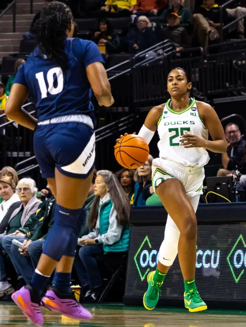 Kelly, who was 3 of 10 with 10 points in Monday’s 93–63 Ducks home win over California Baptist, was efficient in 29 minutes of Oregon’s 76–58 home victory Wednesday over Nevada.
