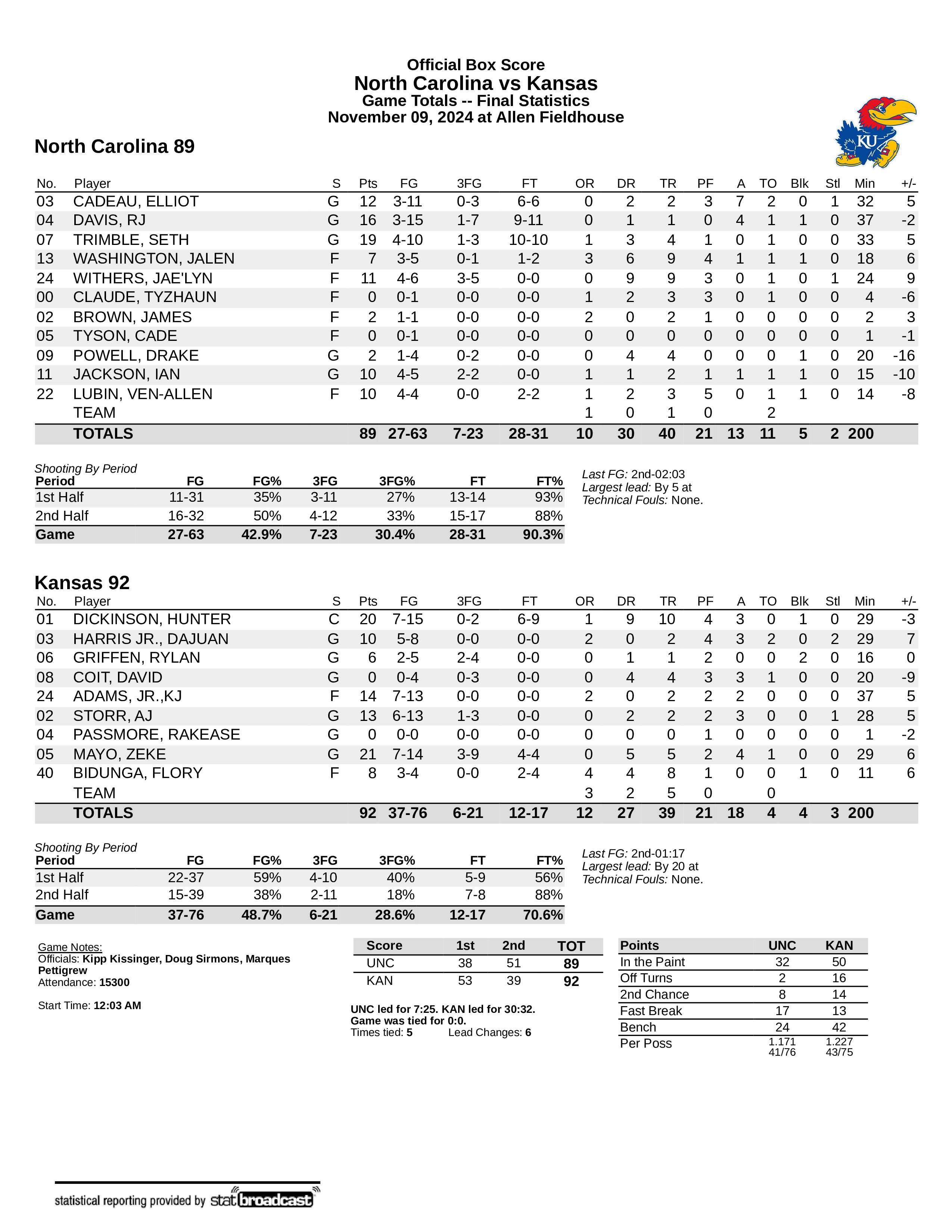RJ Davis scored UNC’s first five points, and the Heels jumped to a 7–2 lead. After Kansas tied it, Trimble drove on Dickinson and drew a foul on a three-point play.
