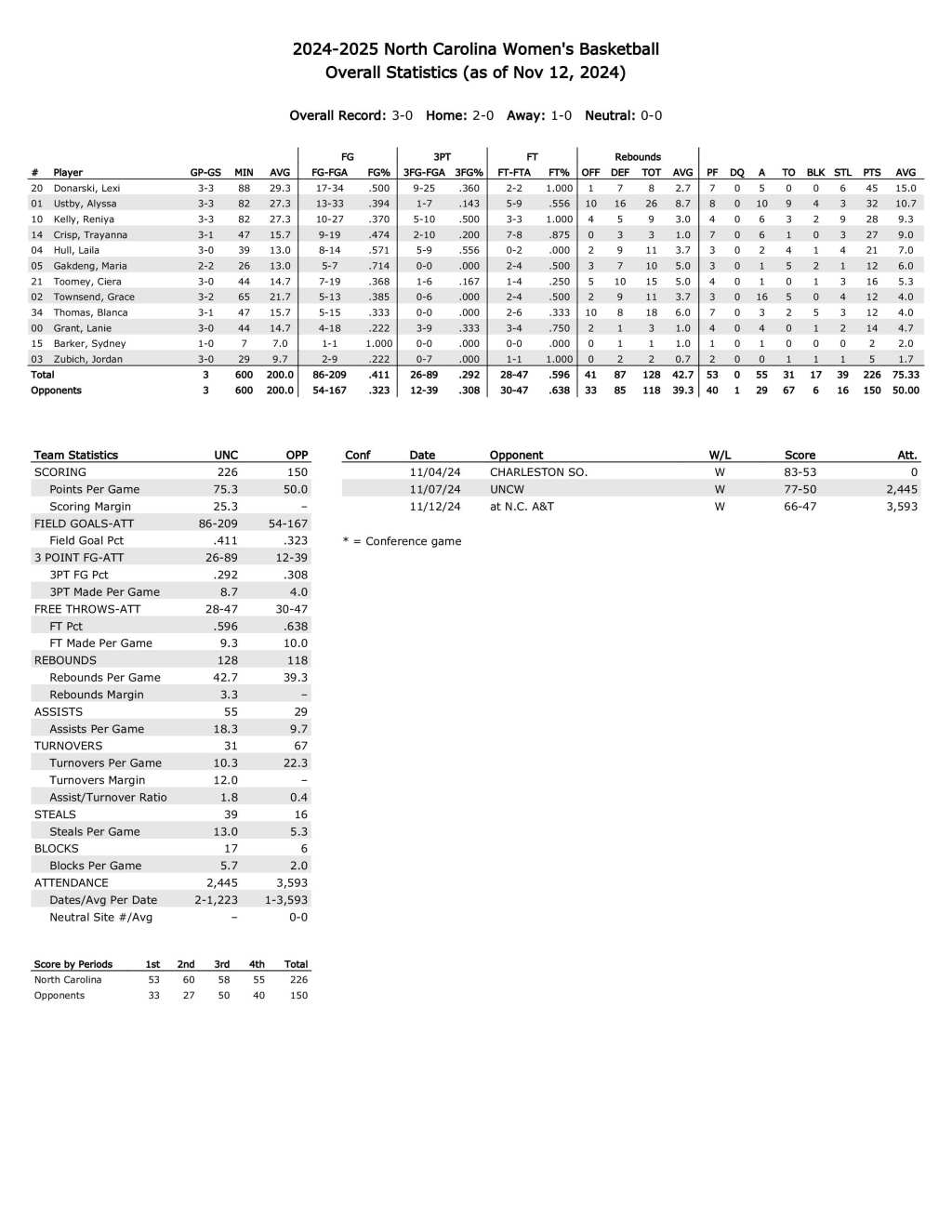 There are too many pure shooters for those shooting percentages not to improve. Seven Tar Heels have scored 3-pointers, led by fifth-year guard Lexi Donarski with nine, and five each from Kelly and redshirt freshman Laila Hull. Hull (55.6%) and Kelly (50%) have been the most accurate.