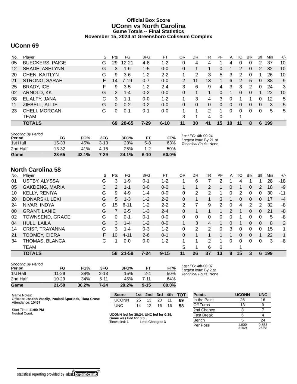 Bueckers poured in 29 points in a 69–58 Huskies win Friday at the Greensboro Coliseum Complex for their seventh consecutive win over UNC.