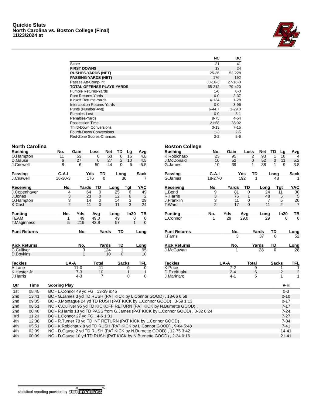 The Tar Heels were behind 41–7 before their second and third touchdowns came on Davion Gause runs of 2 and 10 yards in the final 2:09. Those were the freshman’s first career touchdowns.