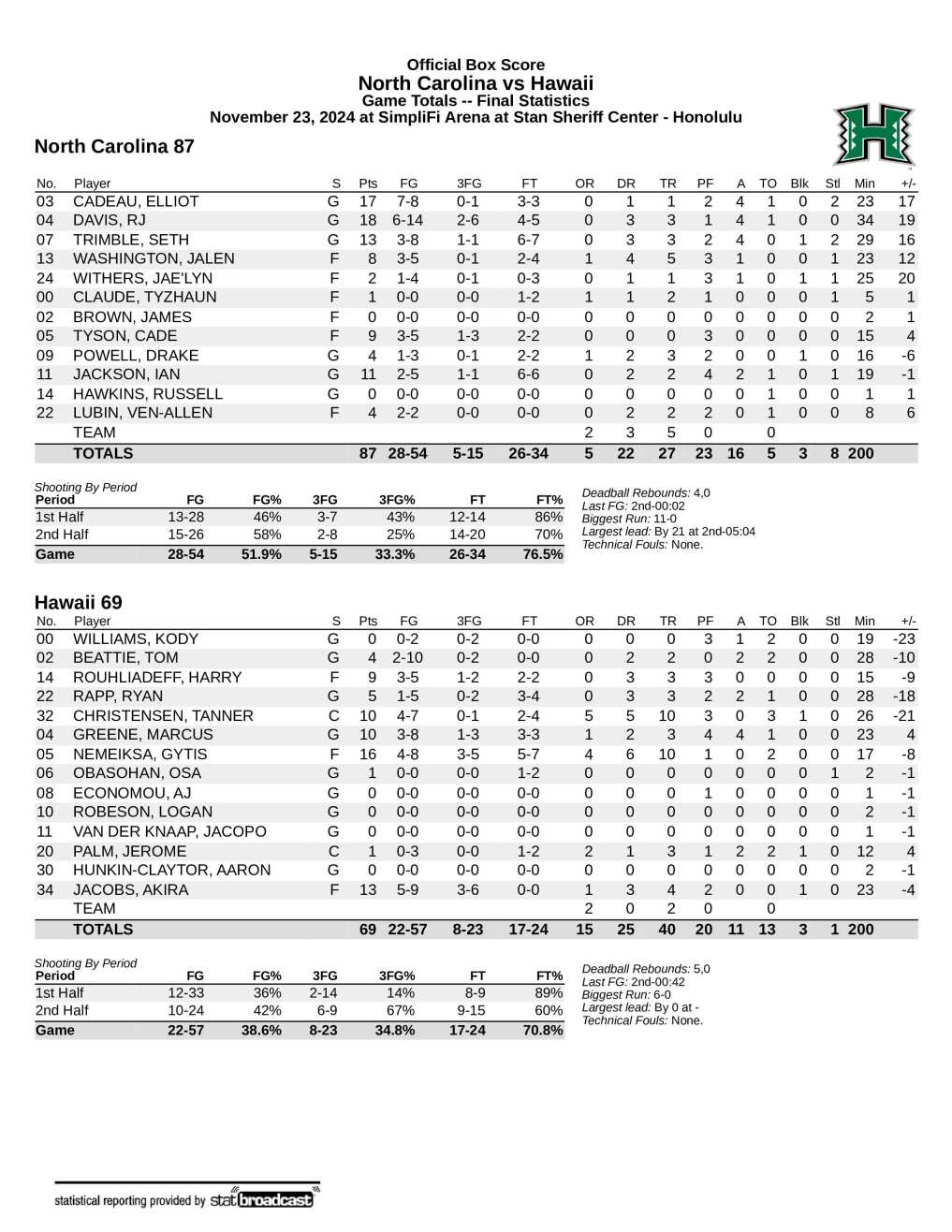Hawai’i (4–1) made only one of its first 10 shots, but Cadeau picked up two fouls in the first 3½ minutes. A transition RJ Davis layup gave UNC a 13–2 lead 6½ minutes into the game.