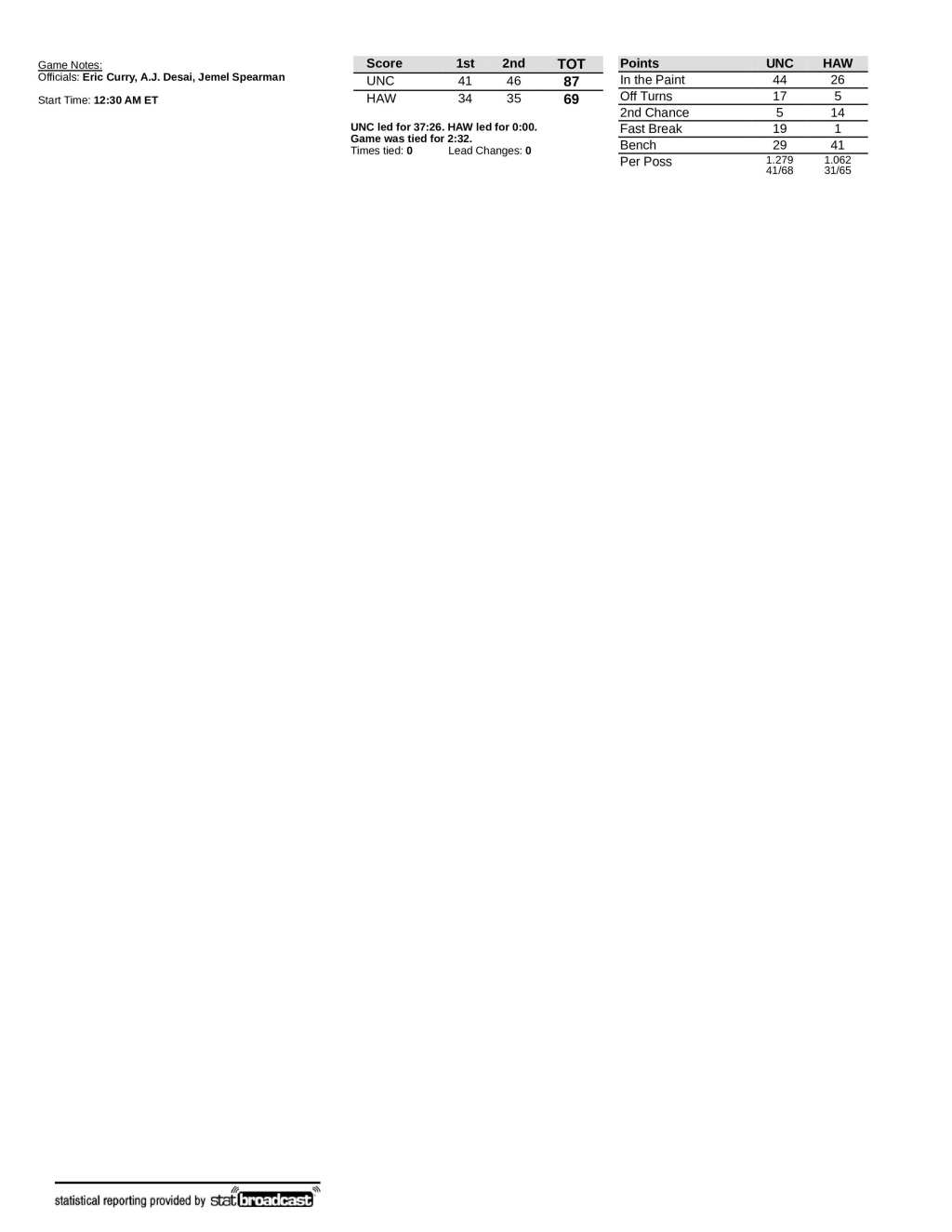 Hawai’i pulled within five on a Harry Rouhliadeff jumper with 4:37 left, prompting Hubert Davis to put Cadeau back in the game. He promptly drove for a three-point play, but the Rainbow Warriors cut it to three before 3-pointers from Davis and Drake Powell in the final minute gave the Tar Heels a 41–34 halftime lead.