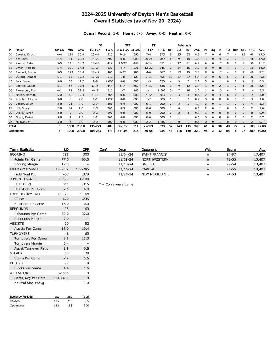 Dayton has four players averaging double-figure points, led by 6–3 senior guard Enoch Cheeks, who averages 15.0 points and 8.3 rebounds, and has 13 steals and four blocks. The Flyers’ other leaders are 6–8 fifth-year forward Zed Key (12.0 points, seven blocks), 6–7 senior forward Nate Santos (11.2 points, 6.2 rebounds) and 6–0 redshirt junior guard Malachi Smith (10.0 points and a team-high 28 assists.)