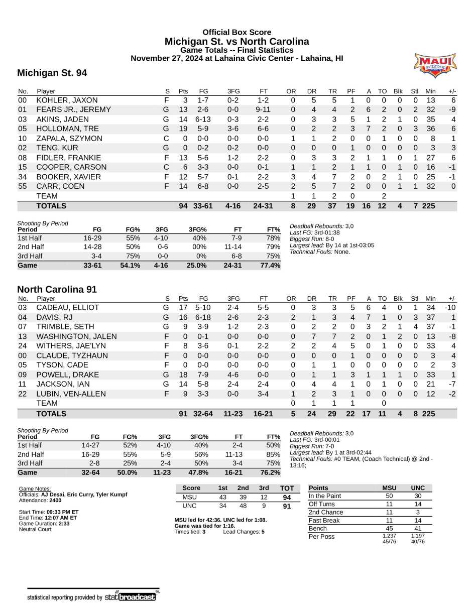 A Powell 3-pointer came after the Spartans jumped out to a four-point OT lead, and two Cadeau free throws gave UNC a one-point lead with 2:44 left. Carolina missed three shots in the next minute after two Xavier Booker buckets, the second with 1:38 left.