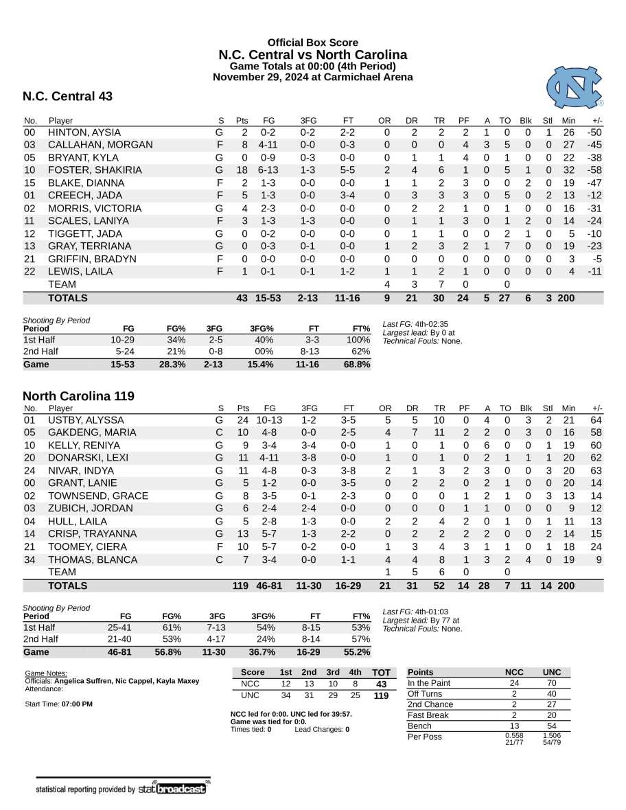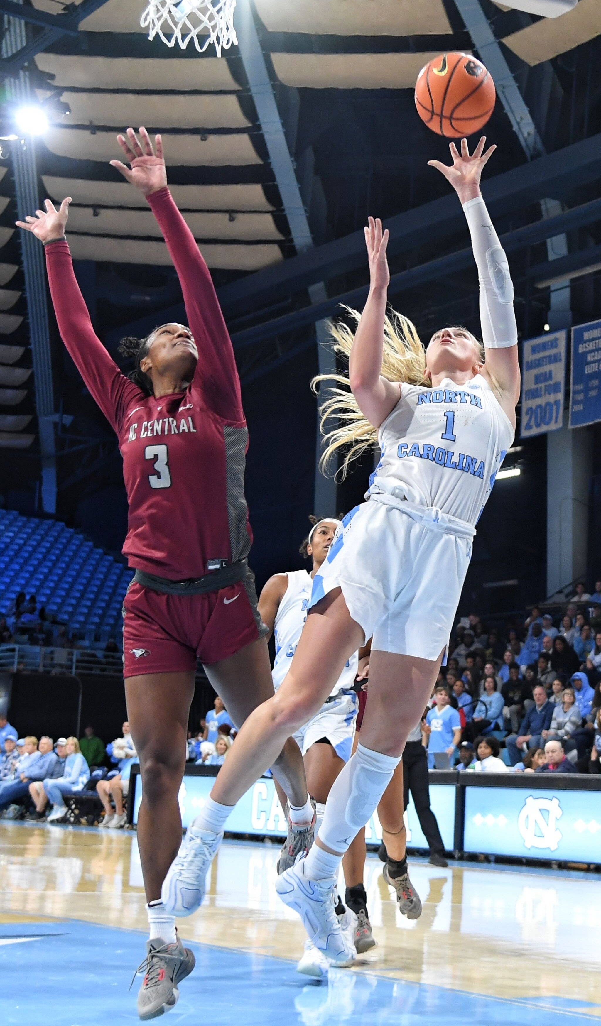 N.C. Central was helpless to hold off the onslaught as the Tar Heels gorged on perimeter-shooting prowess, inside domination, tough defense and board dominance in a 119–43 victory Friday afternoon over the Eagles in Carmichael Arena.