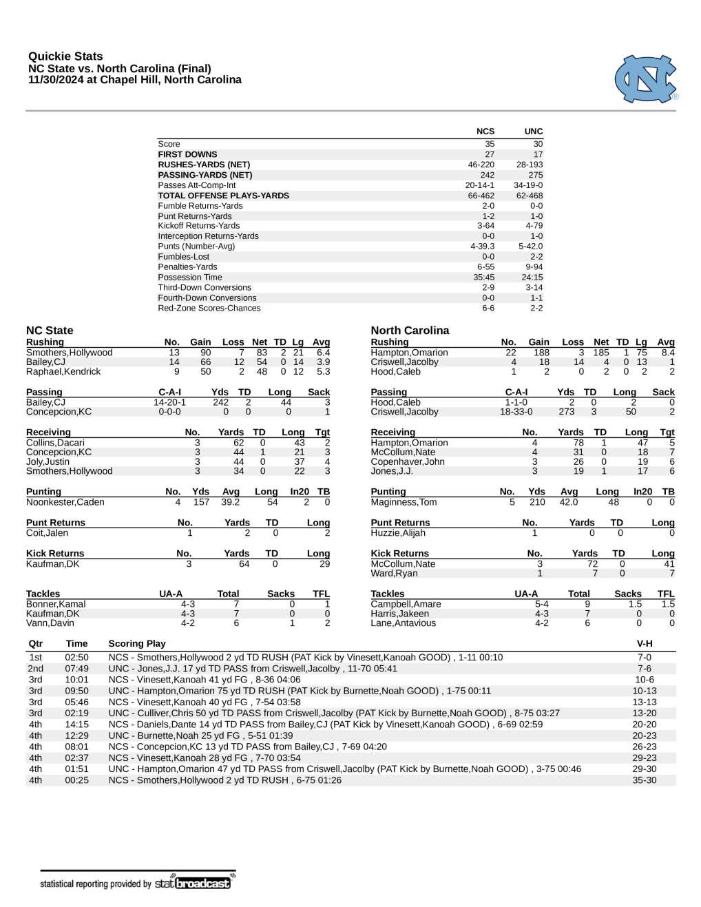 N.C. State scored on every drive after halftime on its way to a 35–30 victory, its fourth straight win over Carolina, on a cool evening at Kenan Stadium full of a range of emotions.