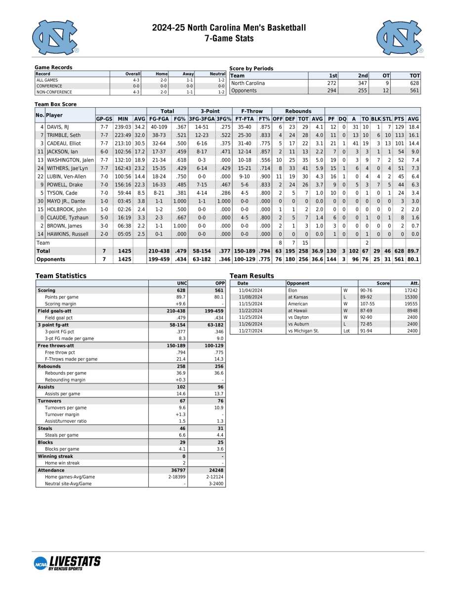 UNC season statistics