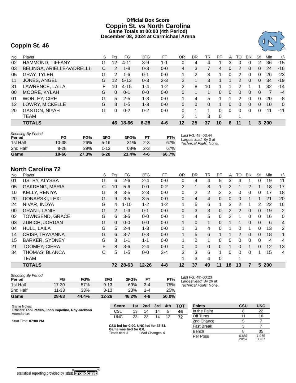 No. 16 UNC 72, Coppin State 46