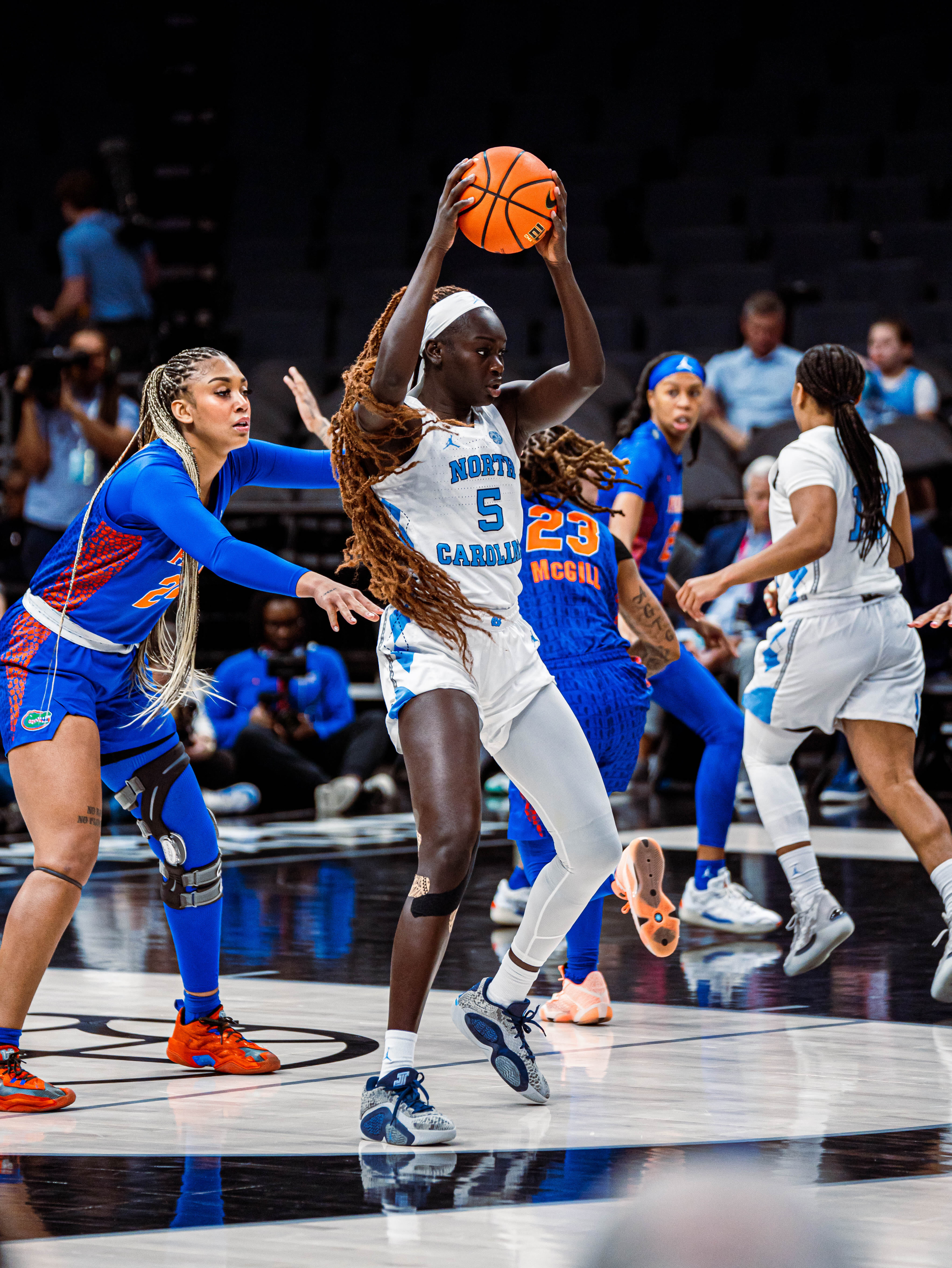UNC’s 6–3 senior center Maria Gakdeng gave up three inches in her matchup with Florida senior Ra Shaya Kyle. But Gakdeng held her own with a game-high 14 points and a team-high eight rebounds, getting Kyle (who came into the game averaging 16.5 points) into foul trouble and holding her to a season-low eight points.
