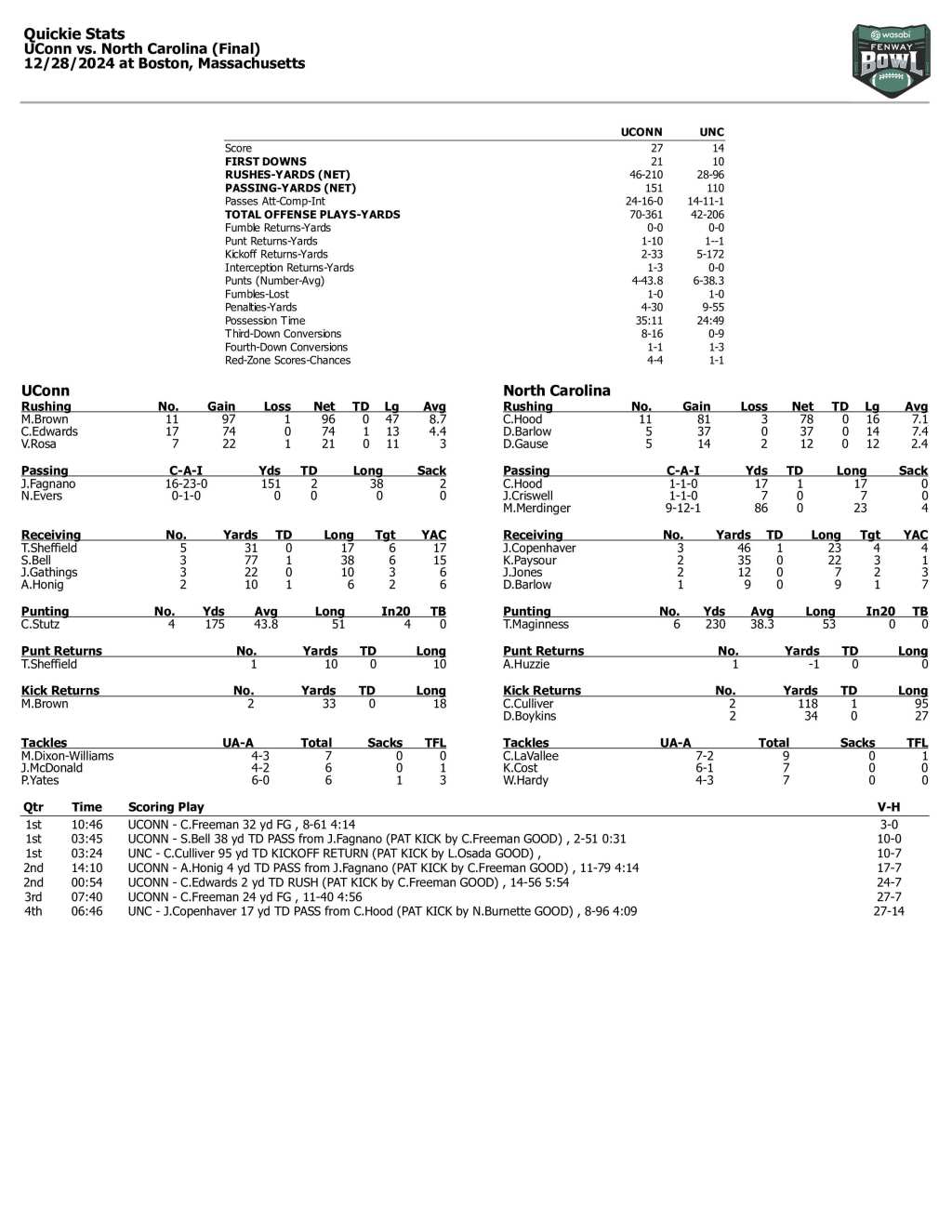 The Tar Heels couldn’t hit on any big plays, other than Chris Culliver’s kickoff return, until a late Caleb Hood-fueled drive, as UConn easily won the Fenway Bowl 27–14 Saturday at Fenway Park before a partisan Huskies crowd.