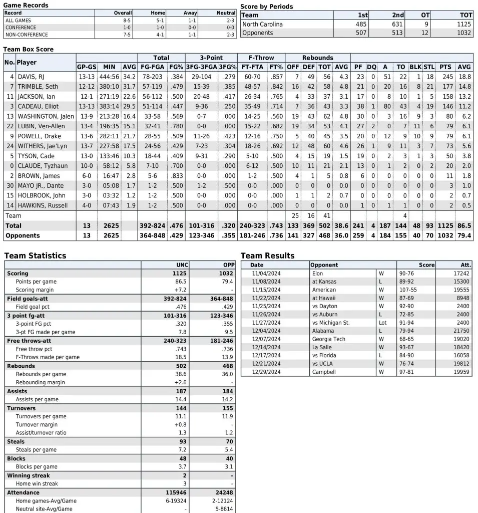UNC season statistics