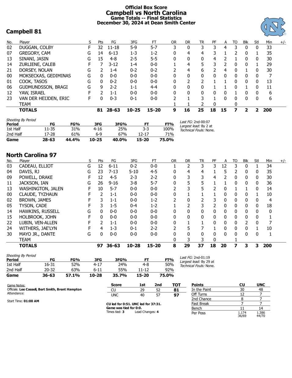 Davis scored three first-half 3-pointers for the first time this season, and Carolina mad six of its first nine shots but only led 14–12 5½ minutes into the game. Campbell scored two dunks and two other layups.