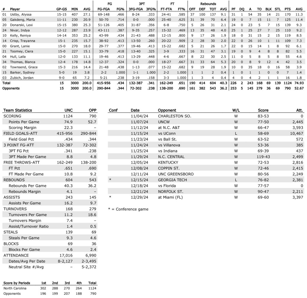 The Tar Heels’ defense has overwhelmed all but two opponents, and UNC lost to both: 69–58 to No. 7 UConn (12–2) on Nov. 15 in Greensboro and 82–76 at home against No. 13 and unbeaten Georgia Tech (15–0, 3–0) on Dec. 15.