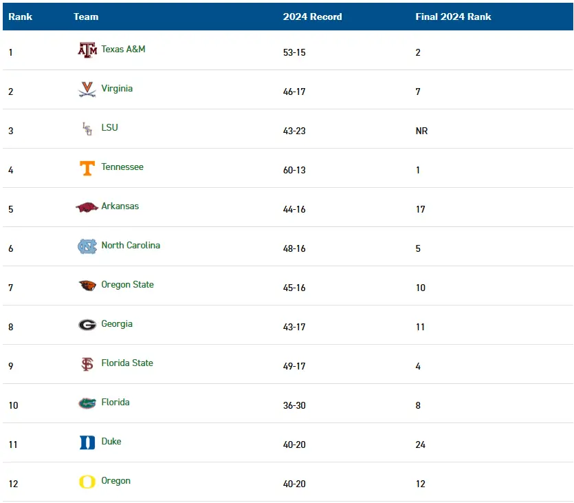 National runner-up Texas A&M (53–15) is No. 1, with LSU (45–23) No. 3, reigning national champion Tennessee (60–13) No. 4 and Arkansas (44–16) No. 5.