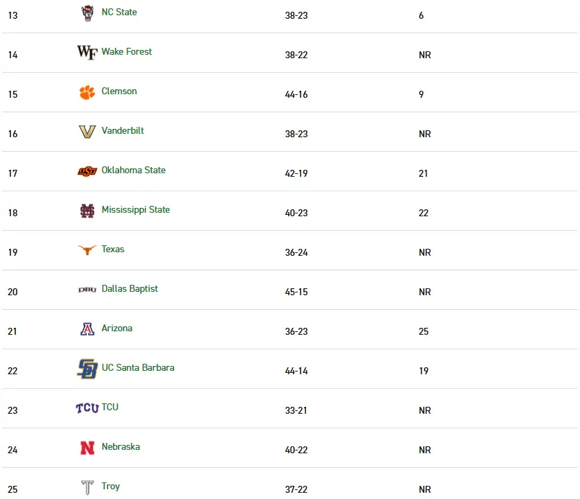 Virginia (46–17) is No. 2, Florida State (49–17) No. 9, Duke (40–20) No. 11, N.C. State (38–23) No. 13, Wake Forest (38–22) No. 14 and Clemson (44–16) No. 15.