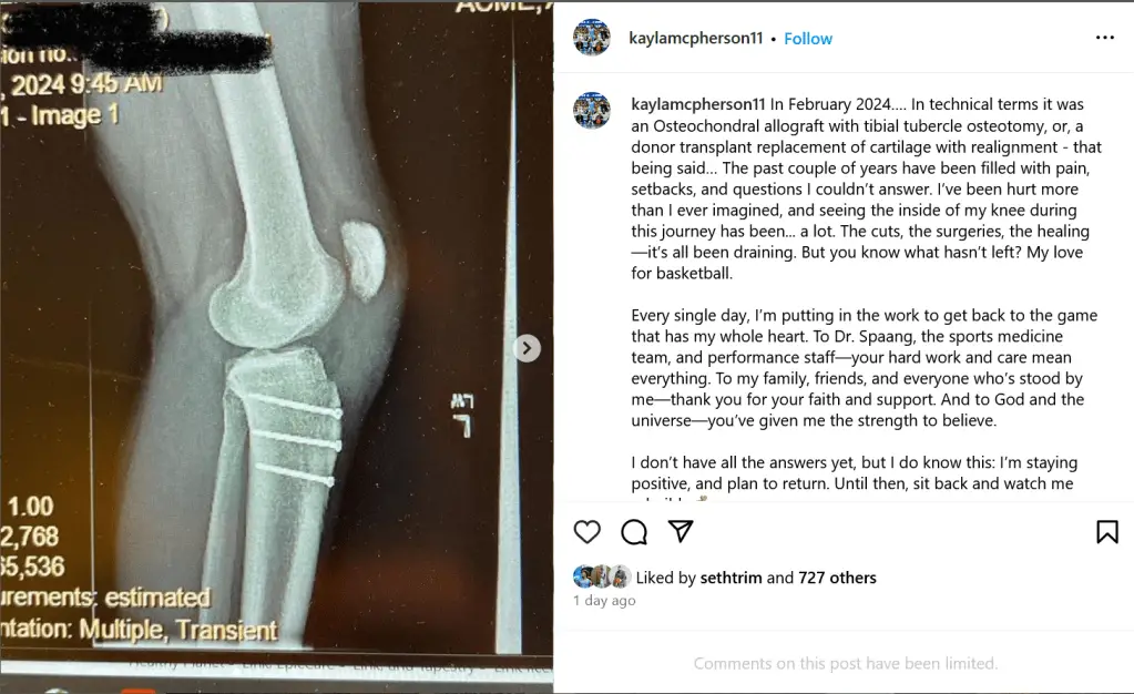 “In technical terms it was an Osteochondral allograft with tibial tubercle osteotomy, or, a donor transplant replacement of cartilage with realignment — that being said… The past couple of years have been filled with pain, setbacks, and questions I couldn’t answer. I’ve been hurt more than I ever imagined, and seeing the inside of my knee during this journey has been … a lot. The cuts, the surgeries, the healing — it’s all been draining. But you know what hasn’t left? My love for basketball.