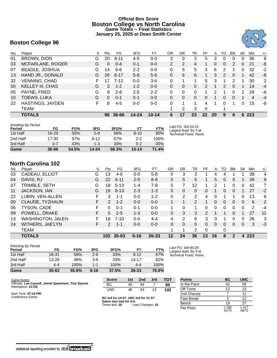 NOTES — Carolina begins the toughest stretch of its schedule, with three of the next four games Quad 1, starting with a 9 p.m. Tuesday game at Pittsburgh (13–6, 4–4), which snapped a four-game losing streak with a 77–73 Saturday win at Syracuse. … ESPN’s “College GameDay” will be in Durham on Saturday ahead of UNC’s game at Duke. … RJ Davis, Jackson, Trimble and Jae’Lyn Withers wore pink shoes. … UNC’s coaches wore custom shoes painted by UNC Children’s Hospital patients. … UNC scored a season-high 58 points in the lane (paint). … It was Trimble’s 13th start and Lubin’s fourth start (all that came consecutively, the last the Dec. 21 UCLA game). Powell was out of the starting lineup for the first time since the Nov. 27 Michigan State game, a stretch of 13 consecutive starts. … UNC shot a season-high 58.1% in the first half. … It was UNC’s second overtime game of the season after losing 94–91 to Michigan State on Nov. 27 at the Maui Invitational. … UNC has won six in a row against the Eagles and leads the series with BC 24–6, including 9–3 in the Smith Center and 6–0 under Coach Davis. … UNC is 8–2 at home and BC is 0–5 on the road. … UNC is 6–1 all-time when scoring at least 100 points in an overtime game against ACC opponents. … It was the first time UNC had scored 100 points in an overtime game against an ACC opponent since defeating Clemson 103–93 on Feb. 10, 2008. … Carolina is 1–1 this season in overtime games and 69–63 all-time. … Carolina is 11–10 in OT games in the Smith Center, winning for the first time since beating Syracuse on Feb. 28, 2022.