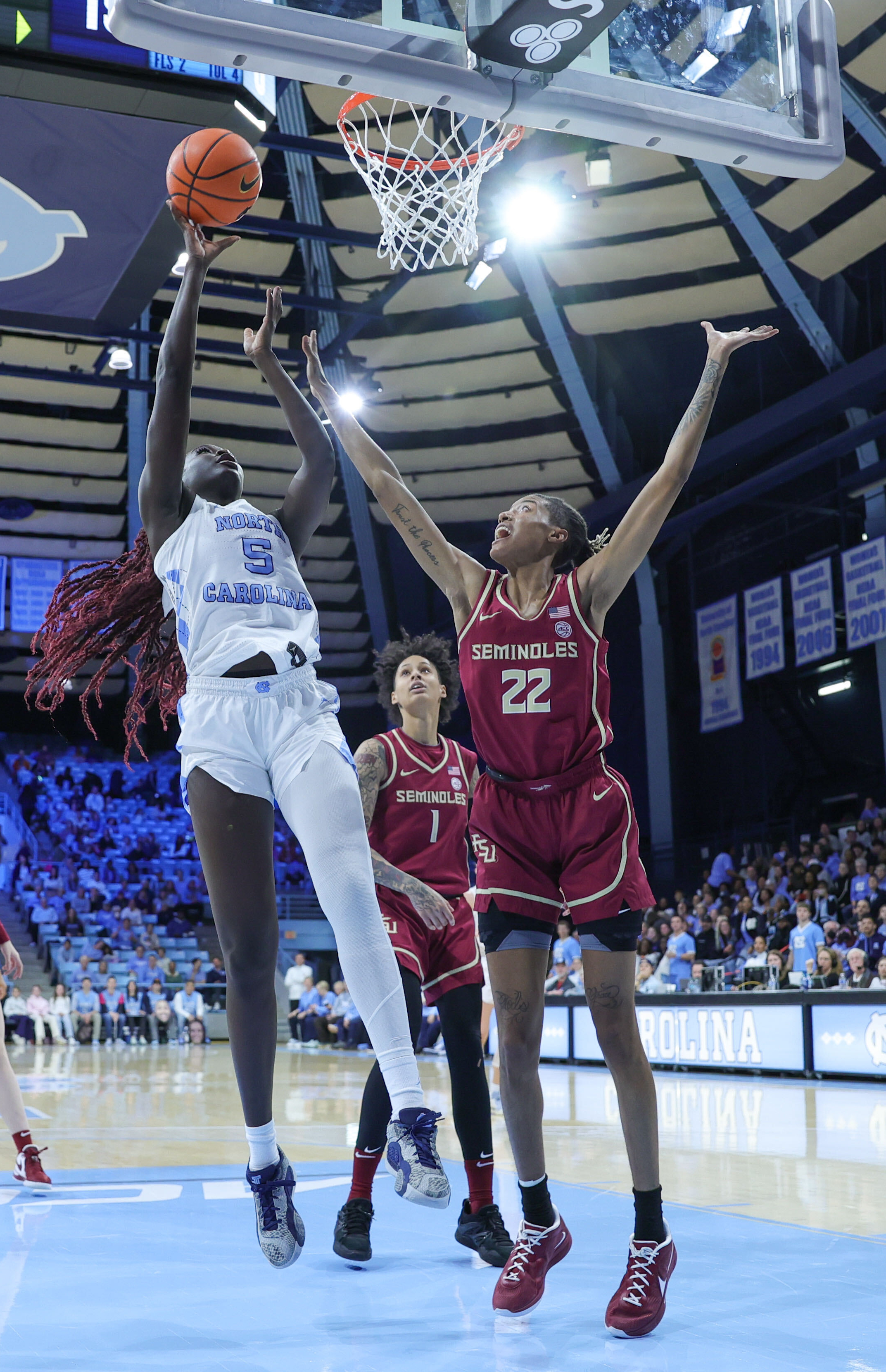 Grant’s two free throws with 51.1 seconds left to cut the deficit to one. After FSU’s Mariana Valenzuela missed a 3-point attempt, Ustby fed Gakdeng for a layup with 18.2 seconds left — Carolina’s first field goal in more than four minutes — for a one-point UNC lead.
