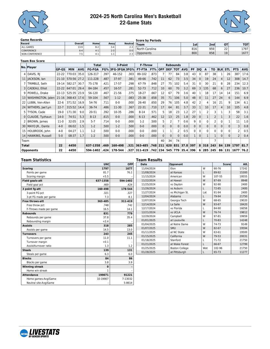 UNC season statistics