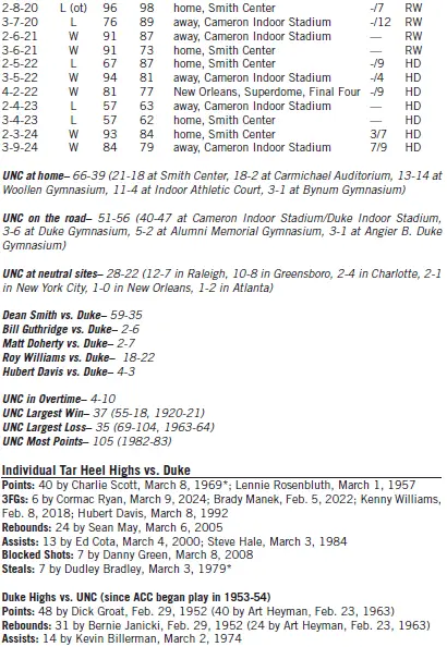 NOTES — Duke, a 13½ point favorite and -1,200 on the money line on FanDuel, is fifth in the country in field-goal percentage (37.2%). … RJ Davis has 2,514 career points and is two behind Virginia’s Bryant Stith (1989–92) for sixth on the all-time ACC scoring list. … In ACC games, Duke leads the league in scoring offense (81.1 points per game), scoring defense (61.0), scoring margin (+20.1), field-goal percentage (49.4%), field-goal percentage defense (39.2%), offensive rebounding (39.0 per game), defensive rebounding (26.9), rebounding margin (+12.1), assists (17.6 per game) and assist/turnover ratio (1.78). … UNC leads the league in 3-point percentage defense in ACC games at 28.0%. … This is the first time an unranked UNC team has faced a top-two team since the Tar Heels won at No. 1 Michigan State 79–65 on Dec. 3, 2023. … It will be the 263rd meeting, with UNC leading 145–11 and the 88th in Cameron Indoor Stadium, with Duke leading 47–40. UNC’s 40 wins at Duke is the most by any school (N.C. State is second with 26). … UNC swept the two meetings last season, winning 93–84 in Chapel Hill on Feb. 3 and 84–79 in Durham on March 9. … Hubert Davis, who went 6–5 as a player against Duke, is 4–3 against the Blue Devils as the head coach. … The “College GameDay” show will air from Cameron at 10 a.m. Saturday, with a crew that includes former Duke players Jay Bilas and Seth Greenberg. … Dan Schulman, Bilas and Jessica Sims will be on ESPN’s call of the game broadcast. … Tyler Hansbrough, who went 4–0 as a player at Duke, will be the color analyst on the Tar Heel Sports Network.