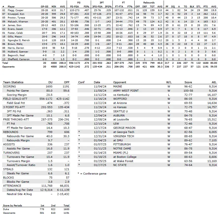 Flagg is averaging 19.9 points (a league-leading 23.5 in ACC games), 8.0 rebounds, 4.1 assists, 1.5 steals and 1.2 blocks.