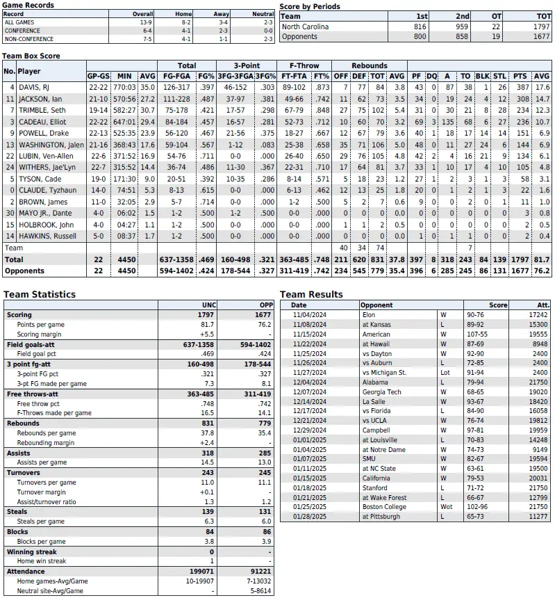 Since UNC’s 11 3-pointers on 50% shooting in the 82–67 home win on Jan. 7 over SMU, when three players had at least three 3-pointers — Powell (4), Davis (3) and Jackson (3) — multiple Tar Heels have scored 3-pointers only twice: against Wake Forest (Davis 3 and Cadeau 3) and Boston College (Davis 2 and Jackson 2).