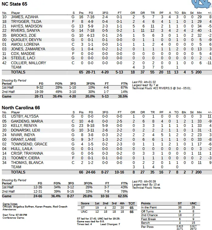 Without Ustby, UNC’s leading rebounder, the Pack owned the boards 55–35 (a season-high rebounding total for State) and two six-point leads late but was only 5 of 13 from the free-throw line, its second-worst shooting this season, and committed 13 turnovers.