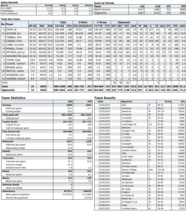 NOTES — Withers, who has 3-pointers in nine consecutive games, is the first Tar Heel with five 3-pointers in a half (doing that in the first half) since Cormac Ryan in the first half at Virginia on Feb. 24, 2024. … The previous 3-pointers high in an ACC game was six by Jason Capel (Clemson in 2001), Harrison Barnes (Clemson in 2011) and P.J. Hairston (Miami in 2013). … The 13 UNC 3-pointers equaled the second-most in an ACC Tournament game (14 vs. Clemson in 1983 with the experimental short three-point line) and 13 vs. Miami in the 2013 championship game. … Carolina scored 43 first-half points, the eighth straight game UNC has scored 42 or more points in the first half. … UNC has won by at least 20 points in each of the last six ACC tournaments. … Cadeau became the first Tar Heel to log double-digit assists in an ACC tournament game since Marcus Paige in the 2013 quarterfinals. … UNC is 32–9 against Notre Dame, including 15–4 in neutral-site games and 3–1 in the ACC tournament. … Notre Dame shot 32.3%, marking the 14th consecutive game a UNC opponent has shot less than 40%. … Carolina has won 26 consecutive games when holding opponents to fewer than 60 points. … Carolina is 169–28 in Charlotte, including 19–3 in the arena now called the Spectrum Center. … The Tar Heels are 165–70 against Wake Forest, including 13–8 in the ACC tournament. It will be the schools’ first meeting in the event since Wake Forest’s 58–52 win in 2000 at the old Charlotte Coliseum on Woodlawn. … Wake Forest won the only regular-season meeting 67–66 in Winston-Salem on Jan. 21.