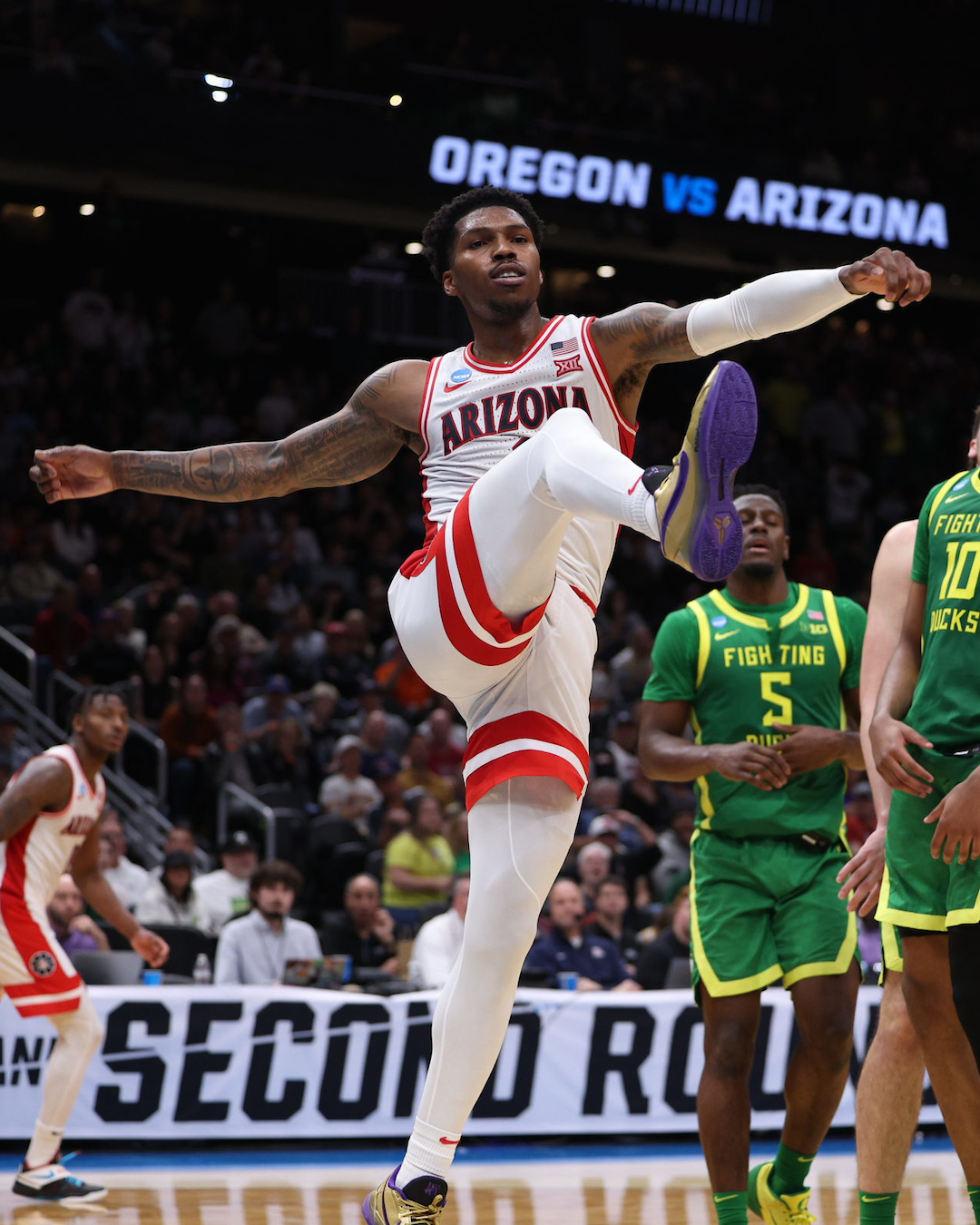 Love, who earned All-Big 12 honors in his fifth and final college season, repeatedly hit mammoth shots down the stretch and scored 29 points and 5 3-poitners in No. 4-seed Arizona’s 87–83 victory over No. 5-seed Oregon in the second round of the NCAA tournament in Seattle.