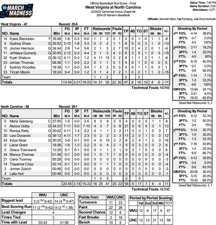 A Nivar drive for UNC’s first field goal in more than eight minutes started an 11–2 run — mostly with Kelly sitting with two fouls — capped by a Grant corner 3-pointer and an Ustby drive to take a six-point lead. Three Sydney Shaw free throws with nine seconds left cut the Mountaineers’ halftime deficit to 24–21.