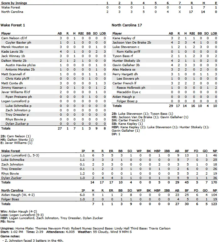 UNC pounded Wake Forest right-handed starter Logan Lunceford (loser, 5–3), who gave up six hits, five runs and three walks in 1⅓ innings, only retiring three batters.