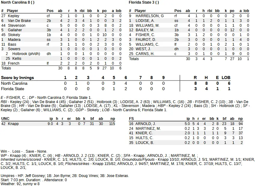 Carolina pushed up the pitch count of FSU ace Jamie Arnold (loser, 6–2), a likely high first-round pick in the MLB draft, and got the best of him. The tough left-hander lasted only five innings, giving up five hits, four runs and two walks with eight strikeouts on 94 pitches. It was his shortest outing since going five innings on April 4 in a home win over Wake Forest.