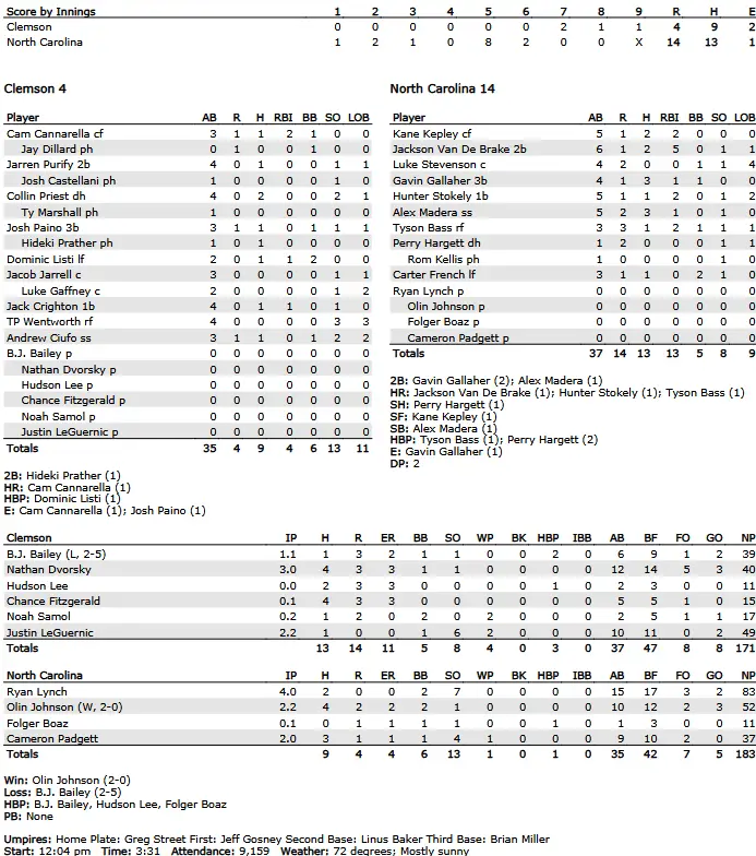 No. 4-seed and No. 14-ranked Clemson (44–16), playing for the fourth consecutive day, ran out of pitching and UNC (42–12) took full advantage in securing its ninth league title. Leading the 13-hit attack with three hits each were Alex Madera and Gavin Gallaher, who hit two off the Blue Monster in left field.
