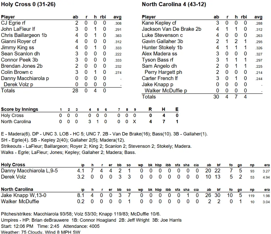 NOTES — Knapp’s previous career-high pitch total was 116 this season against Wake Forest. … This is the NCAA-high 13th time UNC has been a regional host since 2006. … It’s the first NCAA appearance for Holy Cross since 2017. … It was the first meeting between UNC and Holy Cross in 107 years. Holy Cross won 18–1 in the only previous meeting in 1918 in a game in Chapel Hill. … It was UNC’s first game at the Bosh in 21 days (the 6–5 May 9 loss to N.C. State). … Angelo went 1 for 2 with an RBI starting at DH, getting his first at-bats since that May 9 State game and his first game with multiple at-bats since April 30 against Queens. He walked in a plate appearance on May 16 at Florida State. … With Kepley’s two steals, he became the fourth Tar Heel with 40 in a season, joining Brian Roberts (47 in 1997 and 63 in 1998), Russ Adams (45 in 2002) and Chad Holbrook (40 in 1993).