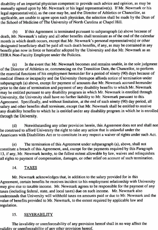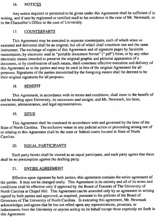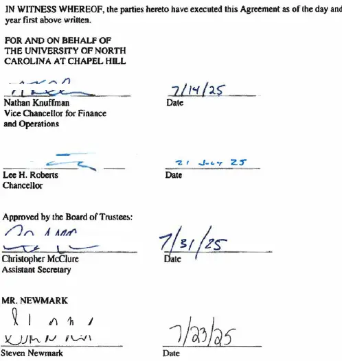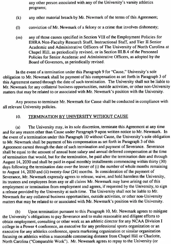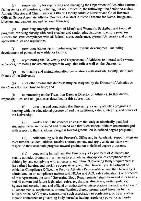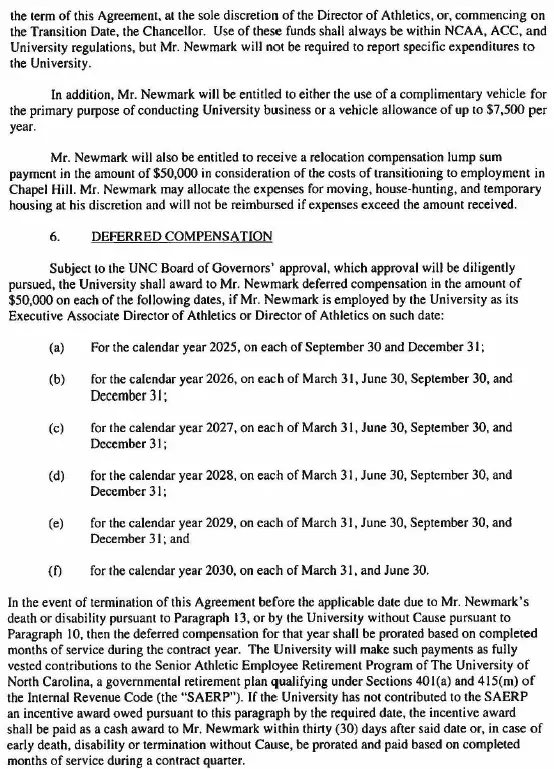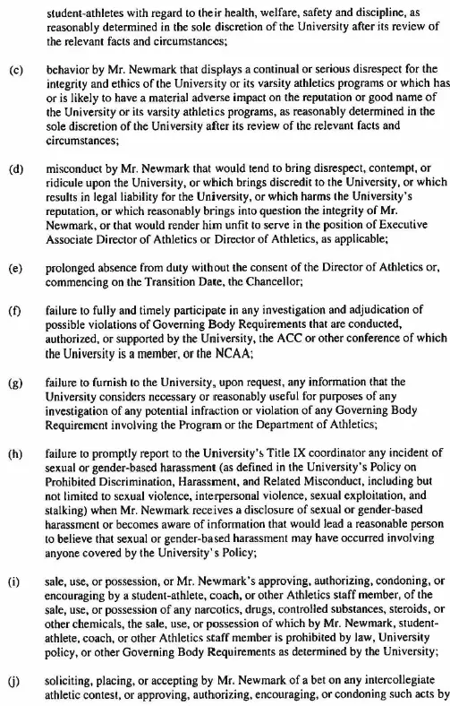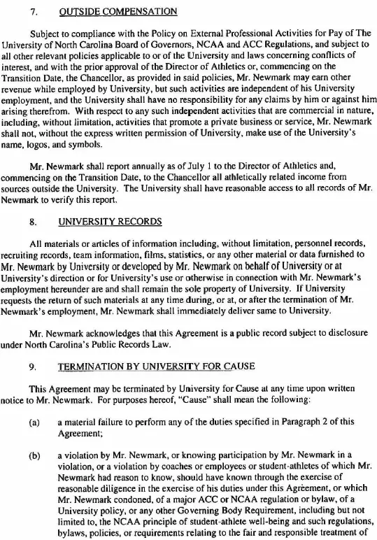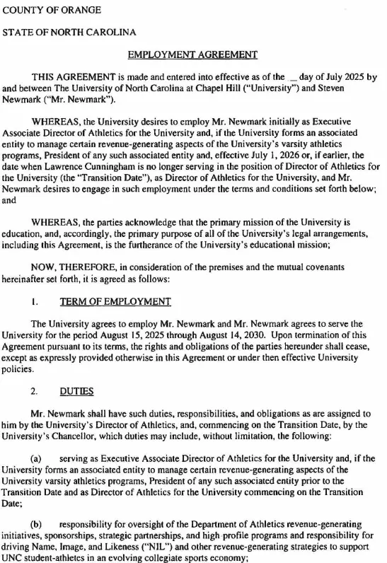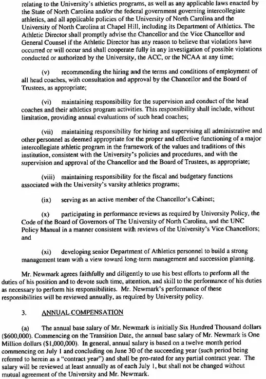 As previously announced, the contract signed July 23, which runs through Aug. 14, 2030, calls for Newmark to serve as executive associate director of athletics while Bubba Cunningham remains athletics director for the upcoming school year.