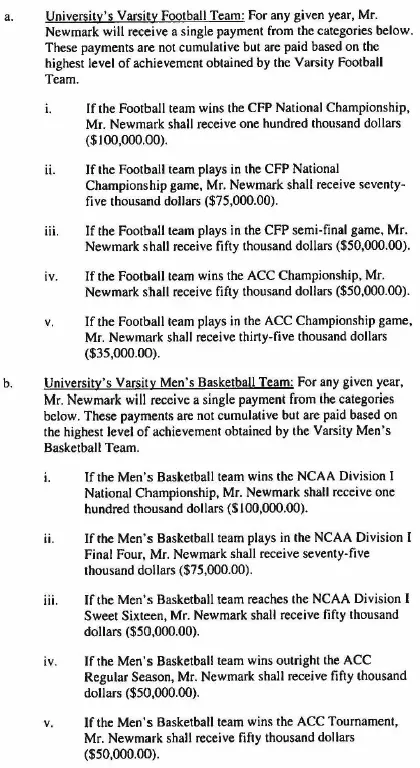 - $50,000 for a CFP semifinal appearance, the men’s Sweet 16, the women’s Final Four, or winning an ACC title in football or men’s basketball.