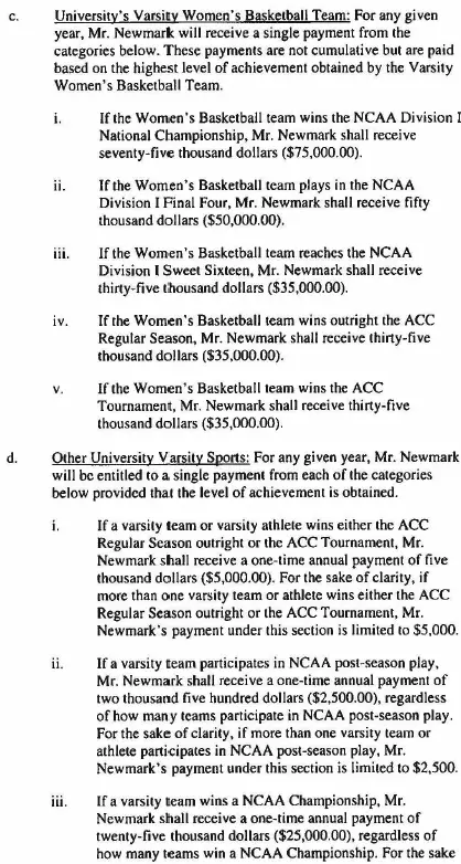 - $35,000 for reaching the ACC football championship game, advancing to the women’s Sweet 16, or winning the women’s basketball ACC regular-season or tournament championship.