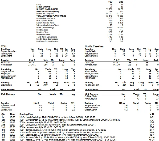 TCU quarterback Josh Hoover (27 of 36 for 284 yards, 2 touchdowns and 1 interception) repeatedly attacked UNC defensive back Marcus Allen while avoiding Thaddeus Dixon, particularly when targeting wide receiver Jordan Dwyer (9 catches for 136 yards).