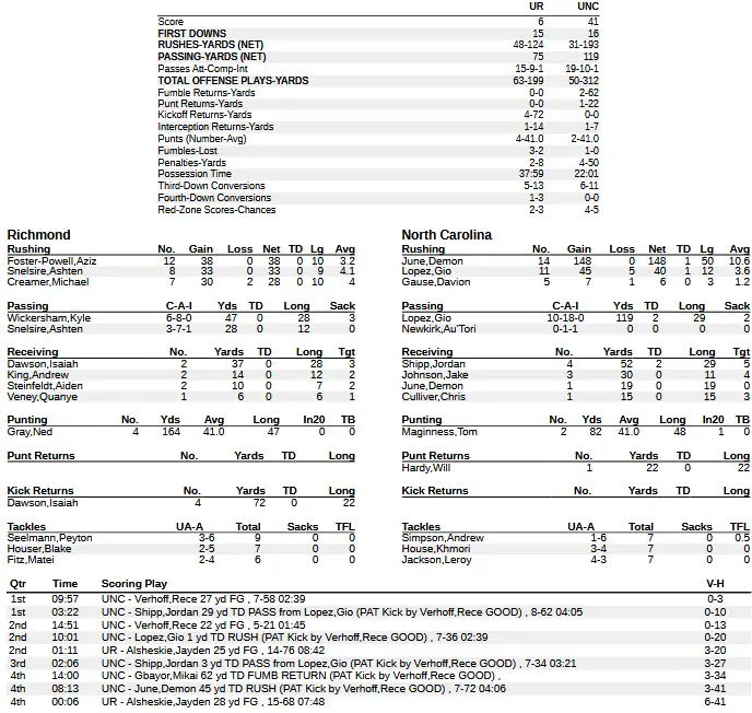 Richmond failed on a fourth-down conversion attempt on a fake punt, giving UNC the ball at the Spiders 25 and leading to a 22-yard Verhoff field goal. After Richmond went without a first down for the fourth consecutive drive, Lopez threw for 19 yards to June before scoring on a 1-yard run.