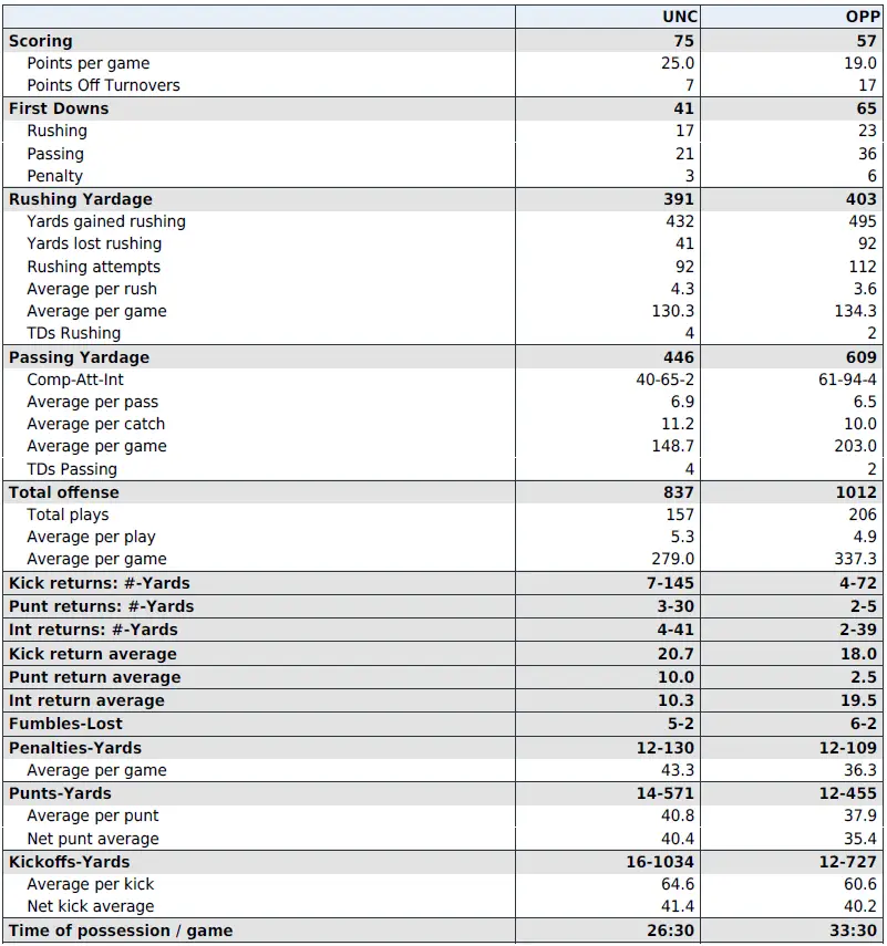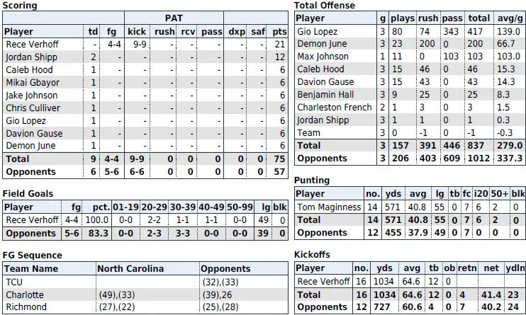 Defensive walls — Both teams enter with strong defenses — UCF hasn’t allowed a first-half point this season, and UNC hasn’t allowed a touchdown in two straight games for the first time since 2012. The Knights are one of three FBS teams, along with BYU and Texas Tech, that hasn’t given up first-half points through two games.