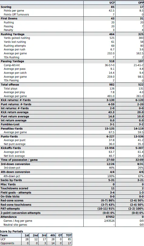 Home and rested — UCF (the school prefers to be called that instead of “Central Florida”) beat Jacksonville State 17–10 in its Aug. 28 opener and N.C. A&T 68–7 on Sept. 6, both at home, and had an open date last week.