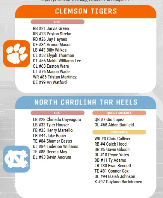 UNC-Clemson injury list