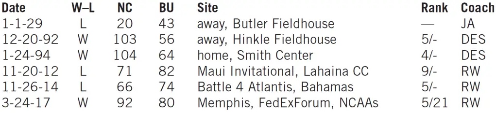 Each team has claimed three wins in six previous meetings. Their history dates back to 1929, when Butler defeated the Tar Heels 43–20 at what was then known as Butler Fieldhouse.