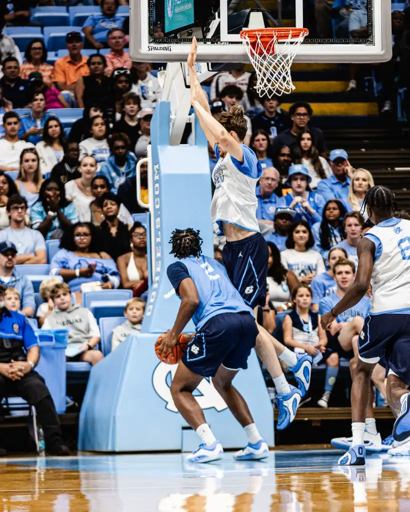 In practices and Saturday’s Blue-White scrimmage, Veesaar’s versatility was on display. He drifted to the perimeter on pick-and-pops, ran clean two-man actions with guards, and used his length to alter shots on defense. He’s not just another transfer filling a roster spot; he’s a skill piece designed to reshape how Carolina’s offense operates.