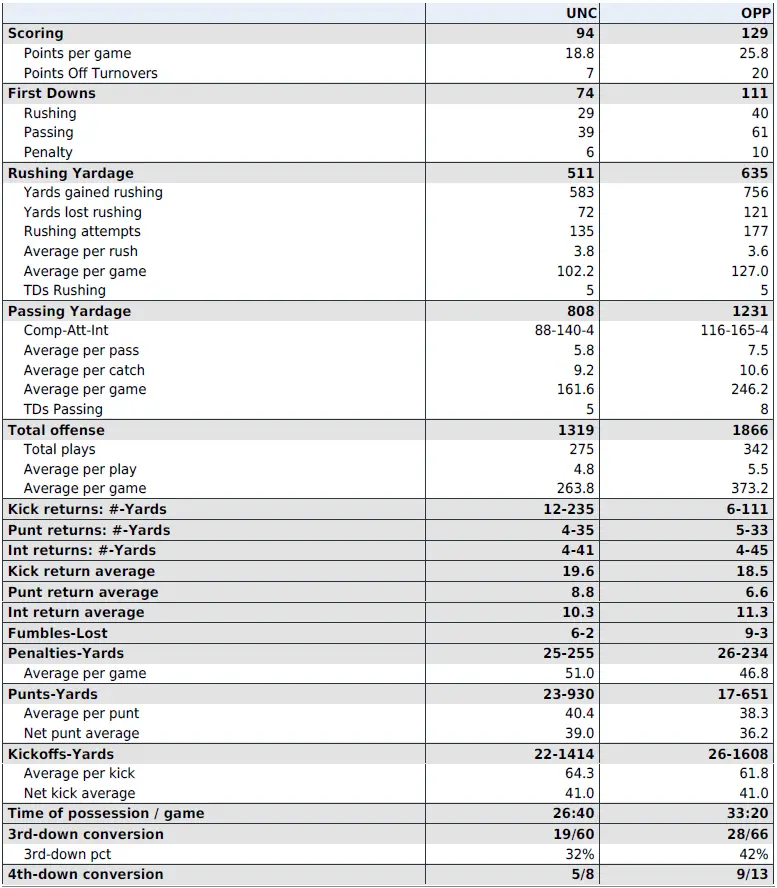 — Carolina 131st in total offense (264.8 yards per game, the second-lowest since 1970) and first downs (70; on pace for 178, which would be the fourth-lowest since 1970) among 134 FBS teams, 122nd in passing offense (162.6, the lowest since 2000 and sixth-lowest since 1985), and 119th in rushing (102.2, the third-lowest since 1970).