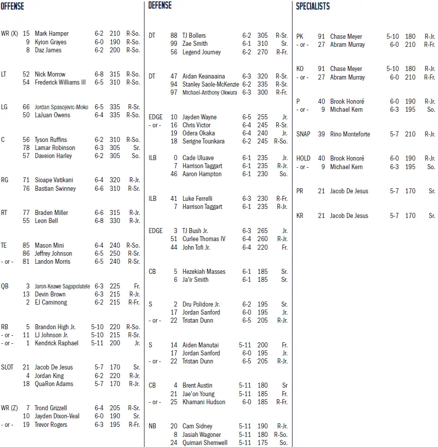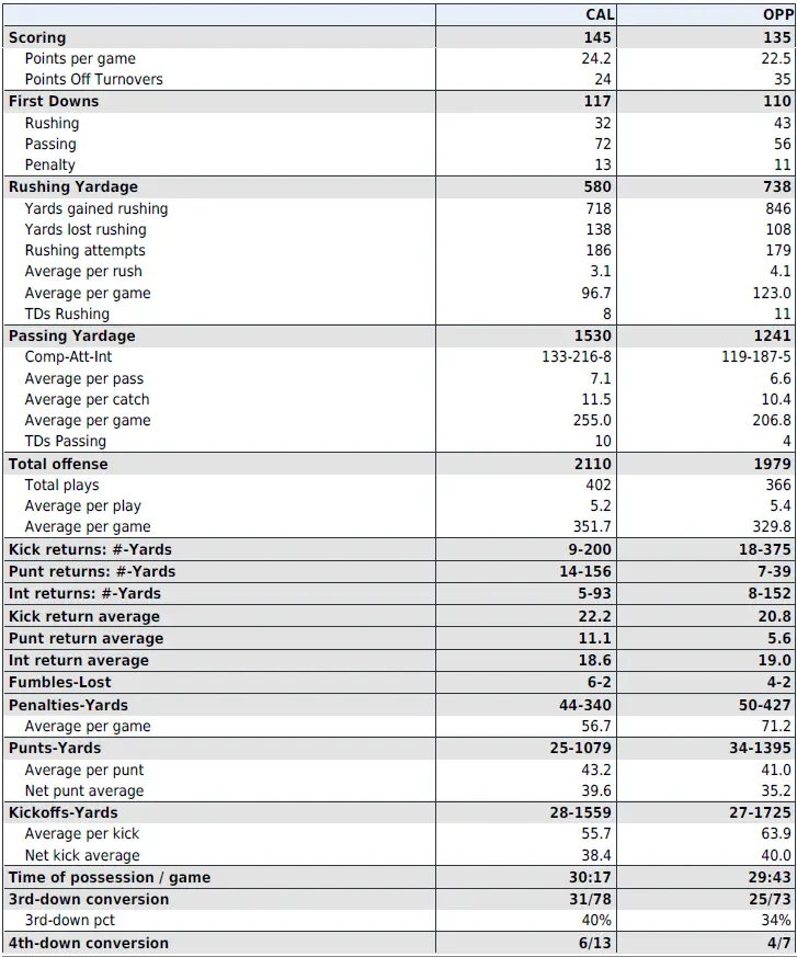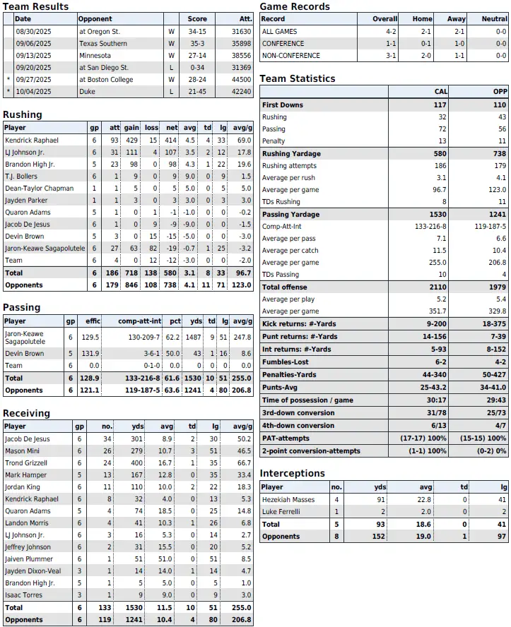 — True freshman Cal quarterback Jaron-Keawe Sagapolutele (top photo) has thrown for at least 200 yards in all six games, including three in which he threw for three touchdowns and seven interceptions. The left-hander ranks sixth in the ACC in passer efficiency (129.2) and passing yards per game (246.5). His passing yards per game rank 32nd in the country, and his 1,479 total passing yards are fifth-most in the conference and 33rd in the nation.