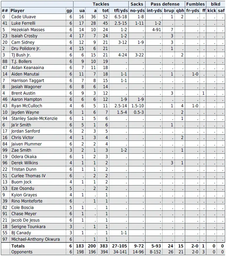 — Cal inside linebackers Cade Uluave and Luke Ferrelli have combined for 97 tackles (2nd-best by two teammates ACC). Uluave is third in the ACC and 27th in the NCAA in total tackles with 52, while Ferrelli is eighth in the conference and 69th in the NCAA with 45.