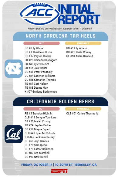 Listed as probable for UNC are offensive lineman Aidan Banfield and defensive backs Ty Adams and Khalil Conley.